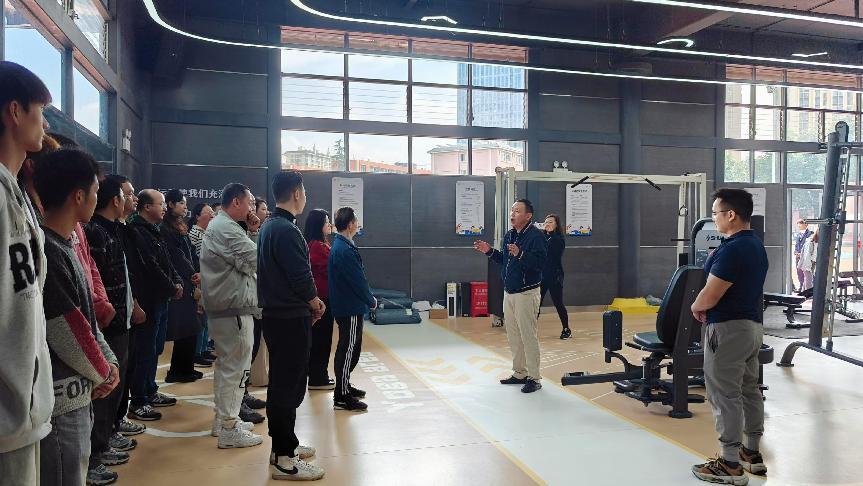 本次开放仪式,校工会特别邀请了专业健身教练到场为教职工们开展健身器械使用安全培训。通过逐一介绍健身房内的各项器材用途,详细讲解正确使用方法及运动安全注意事项,示范指导力量训练基本动作。40余名教职工代表积极参与,全神贯注地学习动作,相互交流心得,现场学习氛围浓厚。