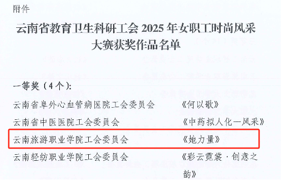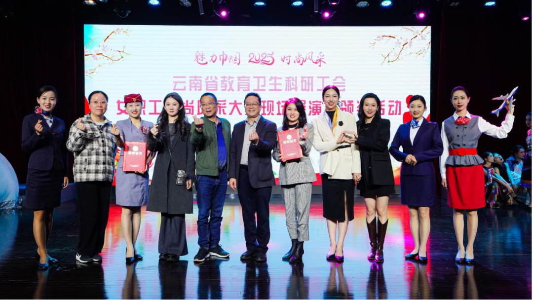 3月5日,云南省教卫科工会组织的2025年女职工时尚风采大赛颁奖及优秀节目展演在安宁城市文化中心剧场圆满落幕,我校文化艺术学院工会小组选送的作品《她力量》荣获本次比赛一等奖、作品《她山之路》荣获三等奖。