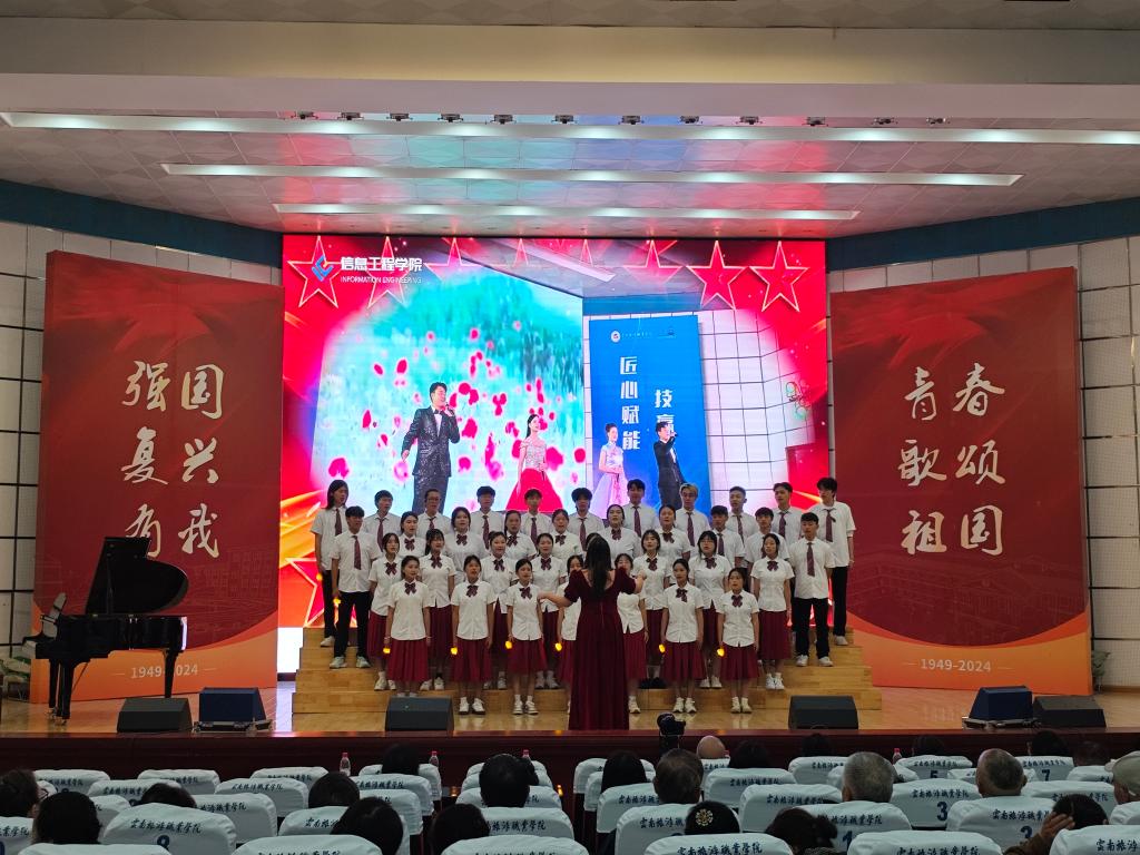 比赛现场气氛热烈,各二级学院的参赛队伍都精神饱满,歌声嘹亮。信息工程学院的参赛同学身着整齐的服装,以昂扬的姿态登上舞台。他们用深情的歌声,演绎着对祖国的赞美与热爱。每一个音符都仿佛在诉说着祖国的伟大历程,每一句歌词都饱含着对祖国未来的美好憧憬。