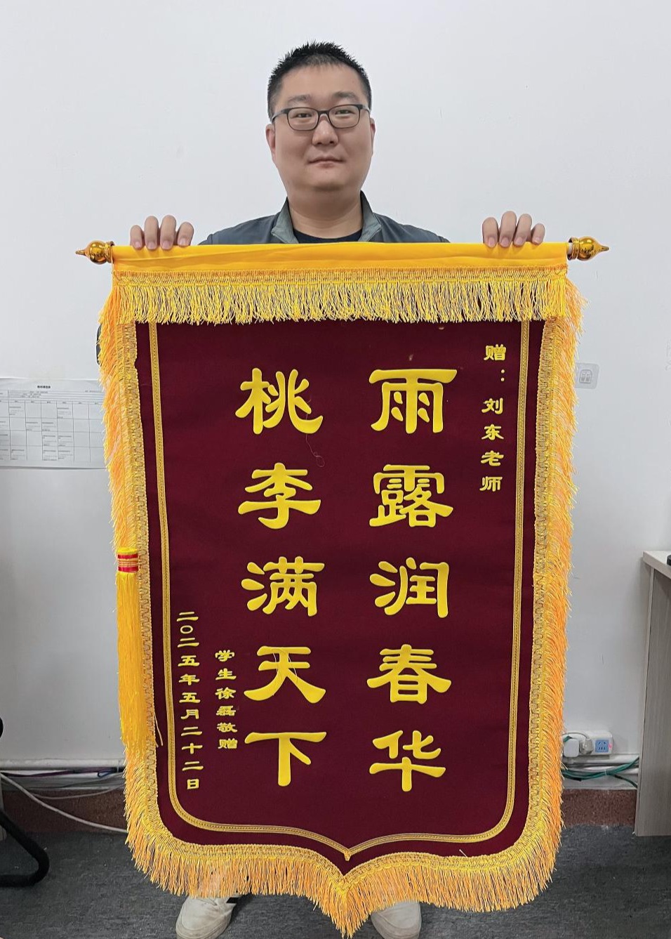在校期间,徐磊同学表现优异,连续两年荣获国家励志奖学金,作为班长带领班级积极进取。他对学院党支部副书记段石林老师、班主任刘东老师、夏羽老师表达了深切的感激之情。徐磊同学衷心感谢学院的培养与关怀,学院严谨治学、资源丰富且重视学生全面发展,为他搭建了广阔的平台。他还特别感谢段石林老师,段老师始终关心学生成长,在思想引领和学业规划上给予支持,让他倍感温暖。刘东老师在班级管理工作中恪尽职守、倾注心血,为班级营造了积极向上、团结奋进的学习和生活氛围。他也十分感激夏羽老师在组织引导方面给予的谆谆教诲,使其在学业和个人成长上受益良多。为表达对学院以及各位老师的感激之情,徐磊同学敬赠锦旗,以表赞扬与致谢。