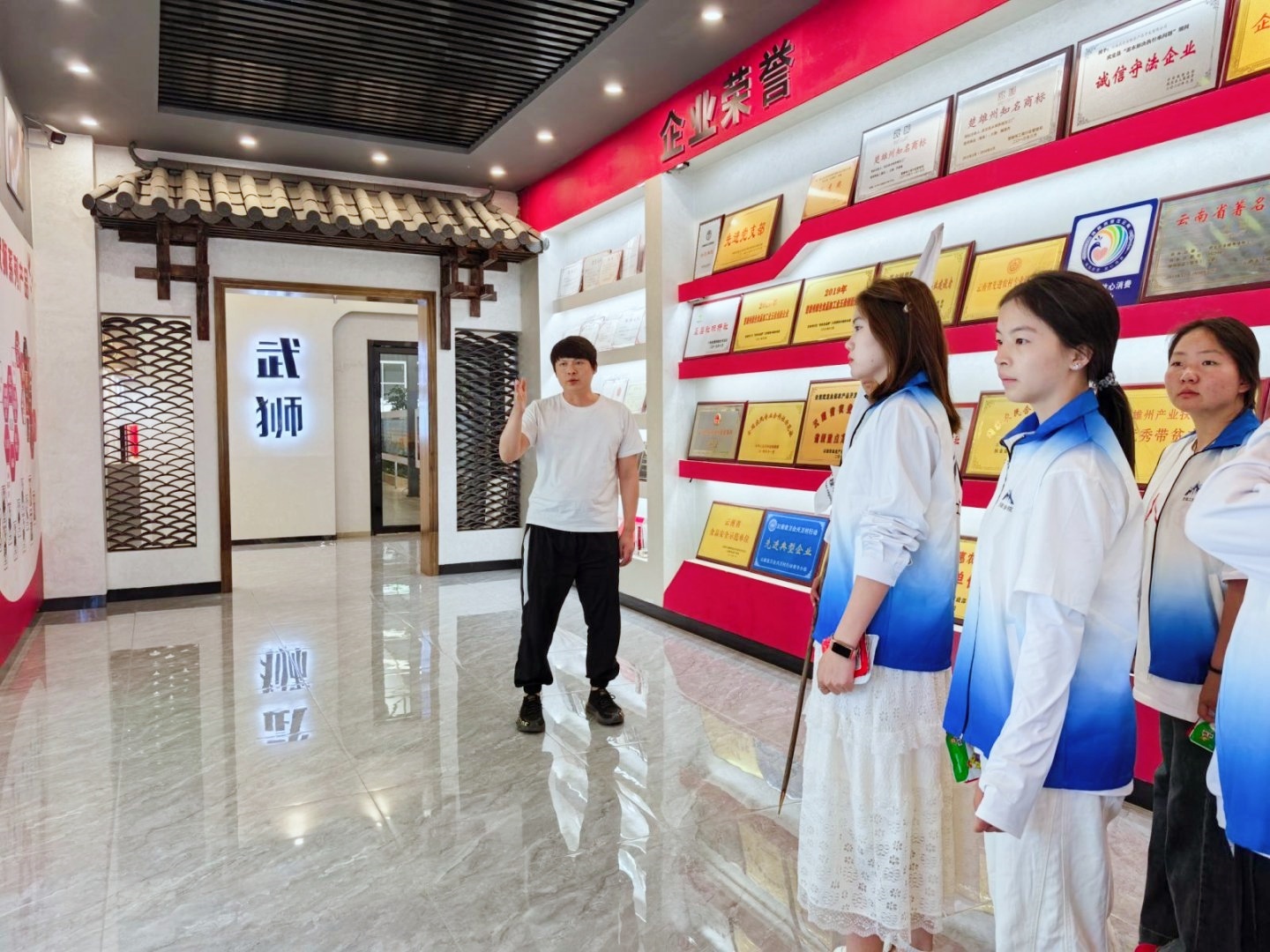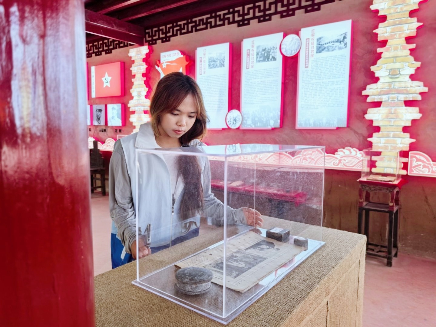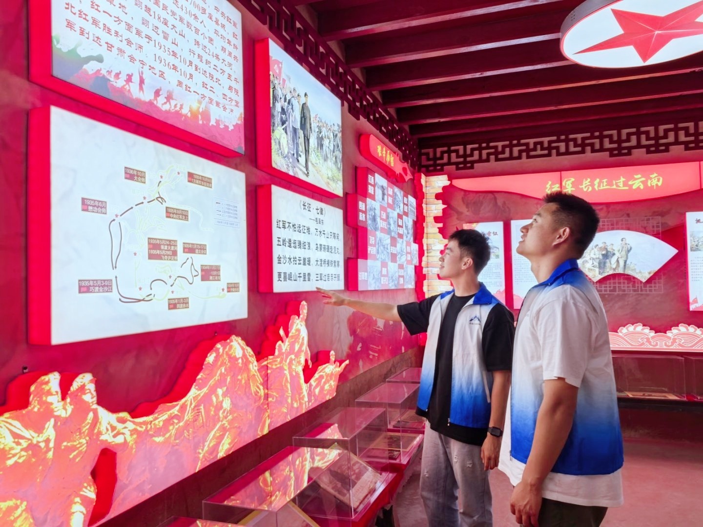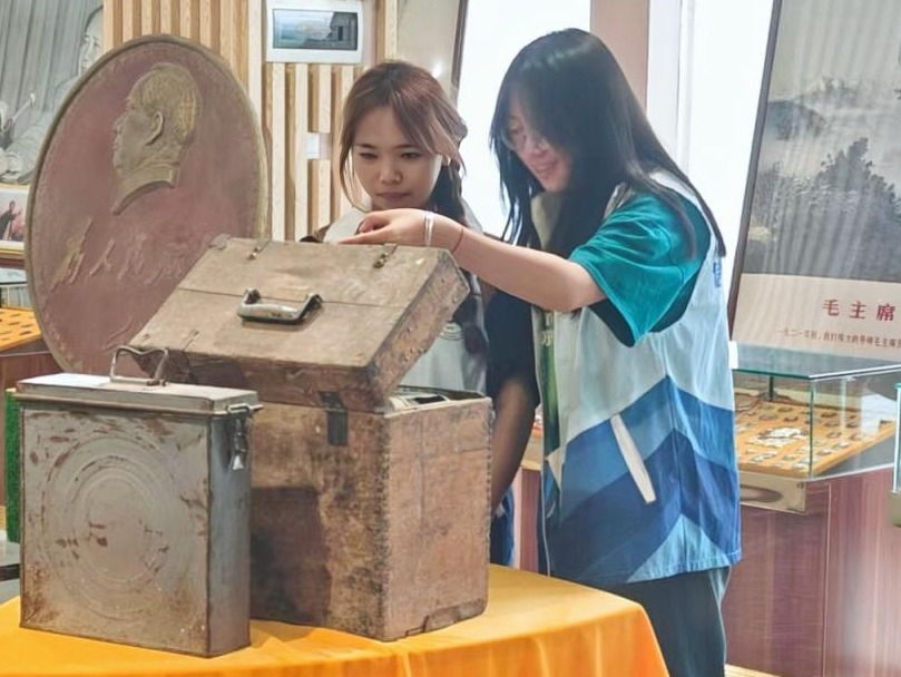 云岭红迹探寻团首站到达武定狮子山红色文化馆。馆内,泛黄的《新青年》杂志残页、锈迹斑斑的步枪与红军马灯、日用品等实物,无声诉说着烽火岁月的故事。同学们驻足于一幅幅像章,一件件日用品、军需品前,深切体会到革命胜利来之不易。