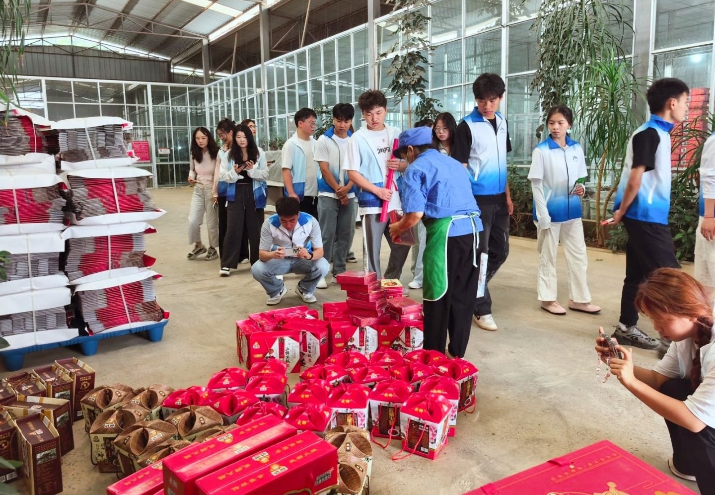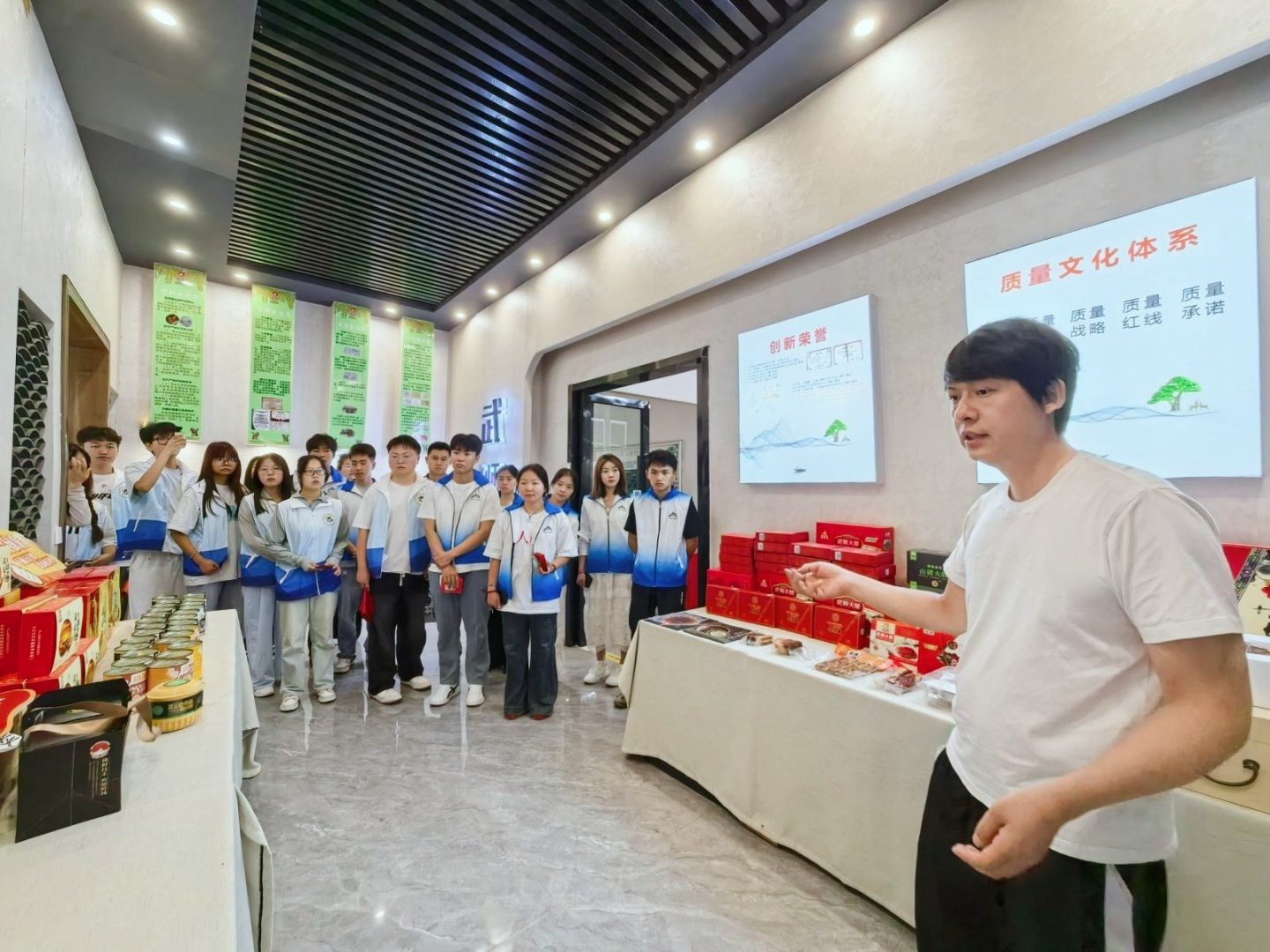在产业园内,公司许经理分享了国家级劳动模范张永芬的经历及企业“多乡村集合、多模式发展”的融合路径,引发同学们的热烈讨论。指导老师表示,希望通过沉浸式劳动教育,让青年理解多模式发展与多专业结合的意义。