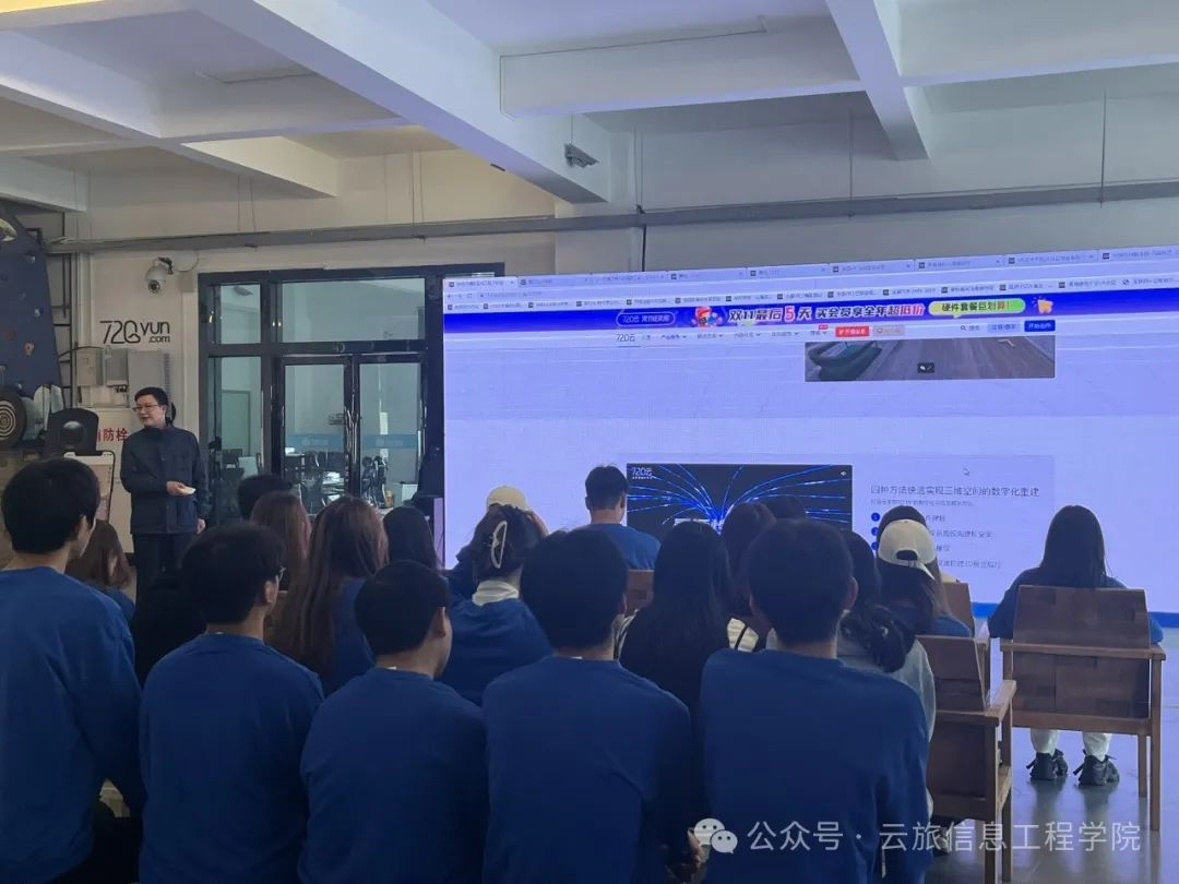 参观学习过程中,同学们在讲解员带领下走进数字展示中心,清晰了解AR/VR展示平台,直观了解数字媒体技术在720云平台、电商平台等方面的实际运用场景。讲解员详细解说每个项目的技术原理与创作思路,同学们认真学习记录,将理论与实际相联系。