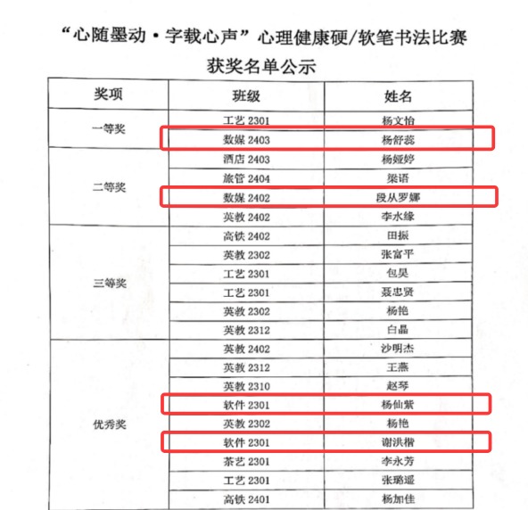 杨舒蕊、段从罗娜、杨仙紫、谢洪楷同学在“心随墨动·字载心声”心理健康硬/软笔书法比赛中分别获一等奖1项、二等奖1项、优秀奖2项。