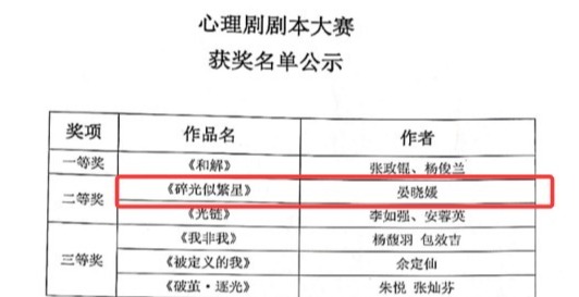近日,我校2025年度“5·25大学生心理健康系列活动”评选结果揭晓,信息工程学院学子荣获多项荣誉。晏晓媛同学凭借作品《碎光似繁星》在第十三届大学生心理剧暨原创剧本比赛中获二等奖。
