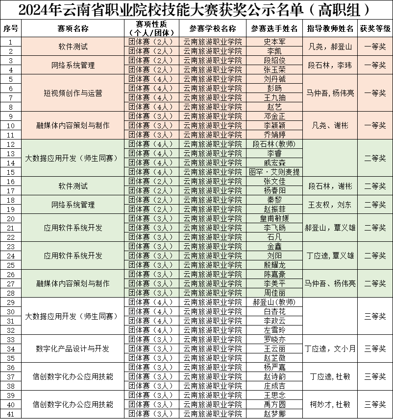 10月28日,云南省教育厅公示了2024年云南省职业院校技能大赛高职组获奖名单。此次大赛信息工程学院派出15支队伍,共计44名参赛选手,参与8个赛项角逐,参赛选手满载而归,斩获14个奖项,其中一等奖4项、二等奖6项、三等奖4项。