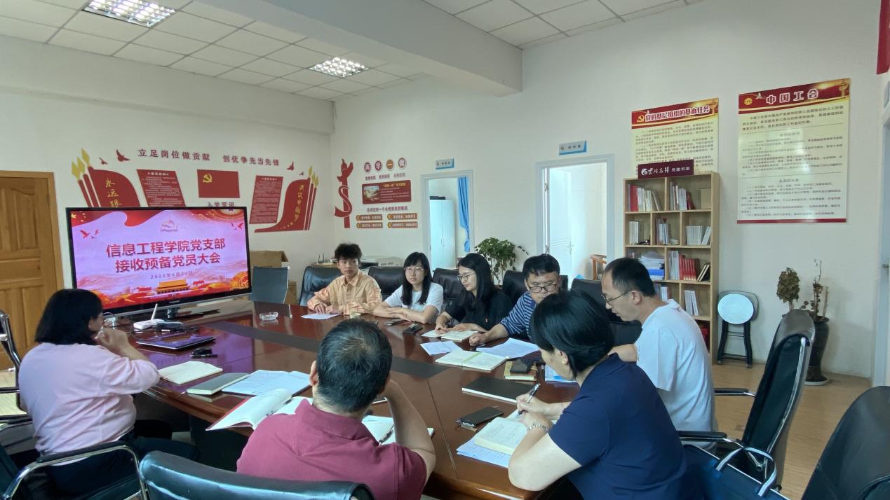 2022年6月22日下午15:00,信息工程学院党支部在综合楼413会议室召开接受预备党员支部大会,学院党委委员杨红英副院长到会指导,会议由支部副书记段石林同志主持。参加此次会议的有信息工程学院党支部全体党员(含预备党员)和发展对象。