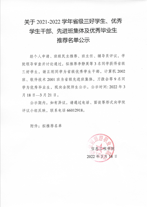 关于2021-2022学年省级三好学生、优秀学生干部、先进班集体及优秀毕业生推荐名单