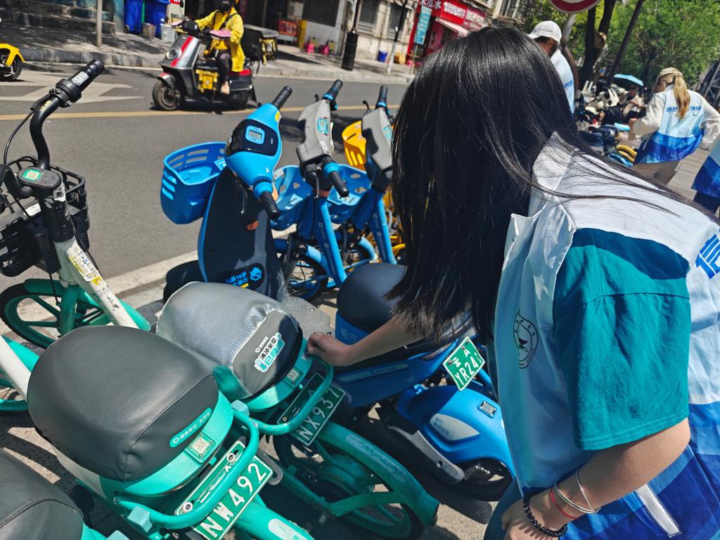 到达现场后,志愿者们迅速分组行动。一组负责整理共享单车,将倒地的单车扶起,把随意停放的单车搬运到指定区域,并按照颜色、类型整齐排列,让原本杂乱的单车停放点变得井然有序。另一组则专注于清理车体表面的小广告。经过几个小时的努力,原本杂乱无章的共享单车停放点变得整齐有序,单车上的小广告也被清除干净,街道环境焕然一新。
