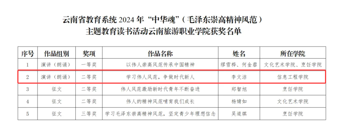 近日,在云南省教育厅主办,云南省教育厅关心下一代工作委员会承办的2024年“中华魂”(毛泽东崇高精神风范)主题教育读书活动中,我院数字媒体技术专业2402班李文洁同学表现卓越,在“中华魂”演讲(朗诵)视频赛项中脱颖而出,荣获二等奖。