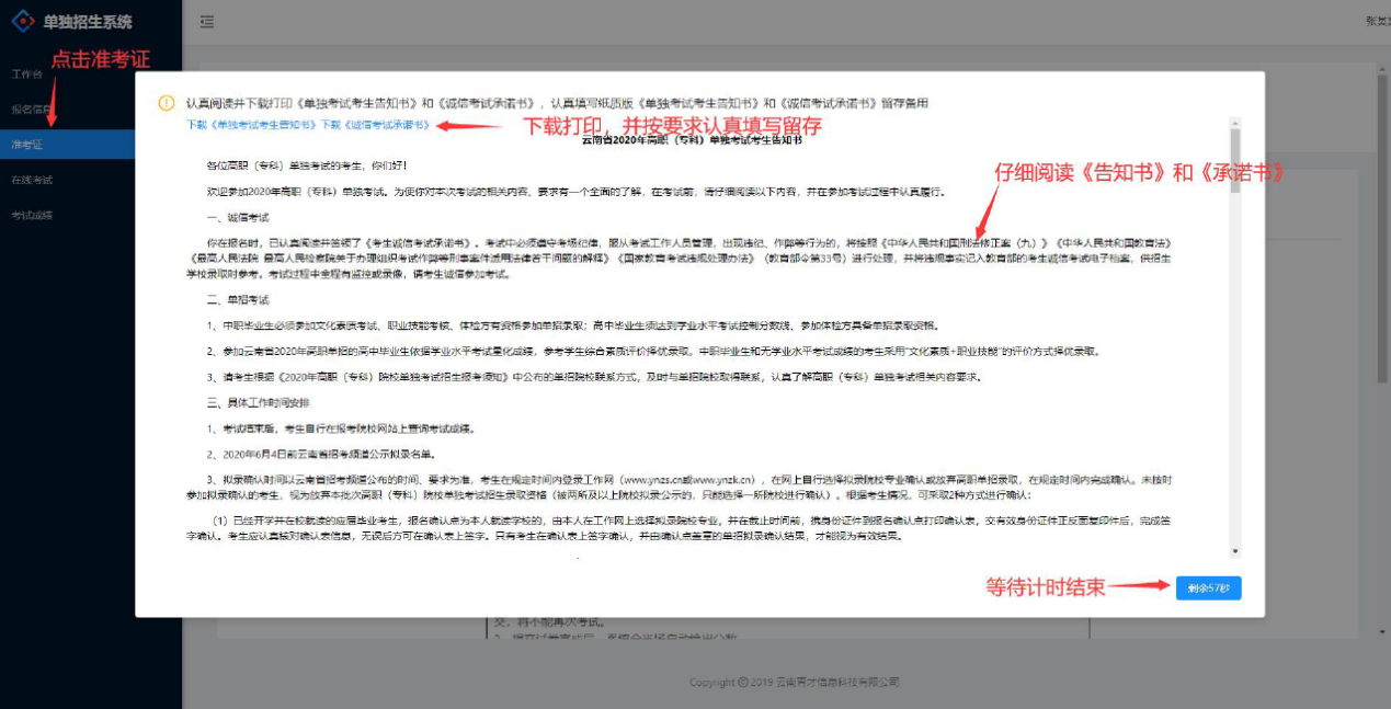 (3) 打印模拟准考证之前,考生须仔细阅读《诚信考试承诺书》、《单独考试考生告知书》。