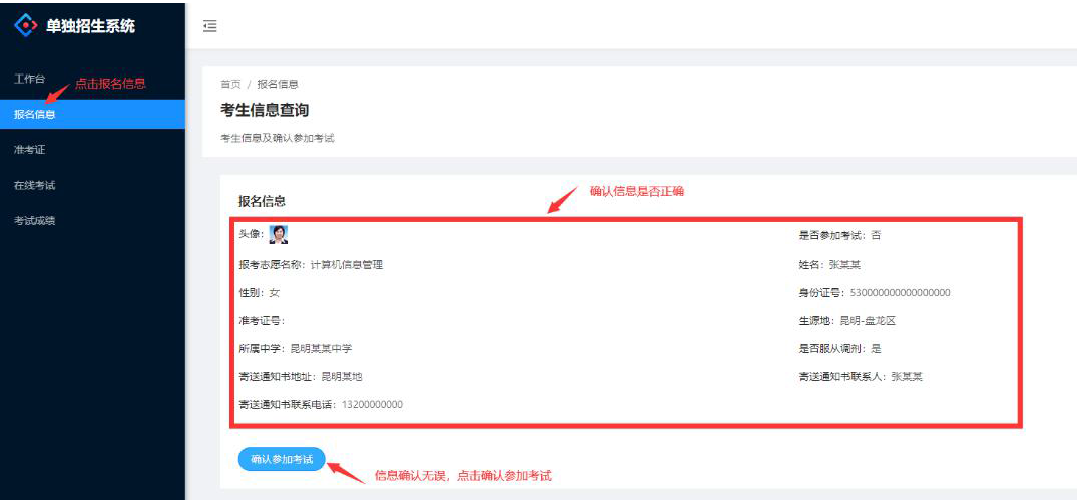 不点击“确认参加考试”的考生,不能参加我校的单独招生考试。