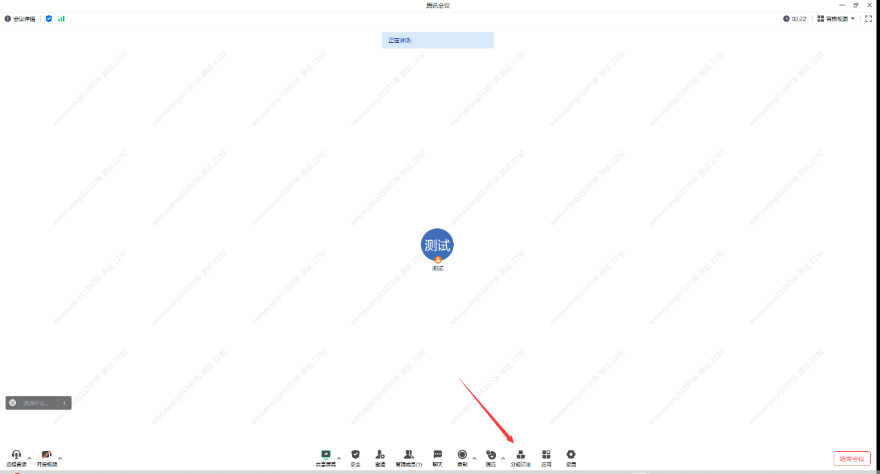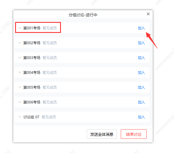 (四)环境准备完成后,考生按照准考证上考场号进入会议室内相应考场备考。具体方法为,点击会议室下放分组讨论按钮,选择弹窗内相应考场号加入即可。