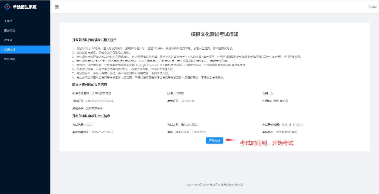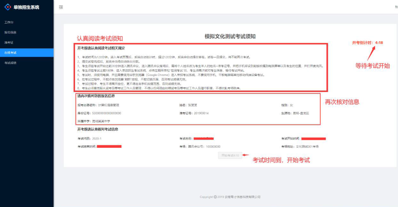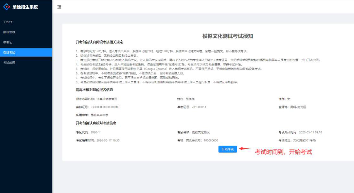 (五)考试开始之前15分钟,考生登陆单独招生考试系统,点击左侧菜单栏“在线考试”后,核对考生信息,等待考试开始。