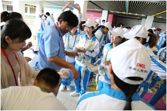 在现场,黄绍勇副校长亲切地询问了志愿者的专业、年级、工作情况,热情地对志愿者在岗位上遇到的困难给予关怀,并对于志愿者们的劳动成果和辛勤付出给与高度的肯定,同时还暖心送上了可爱可口的小礼物,小白云们吃在嘴里甜在心里。