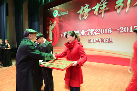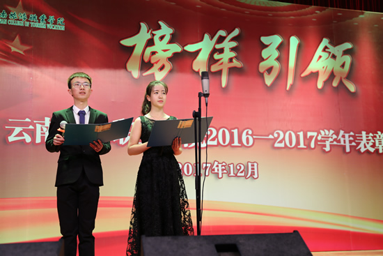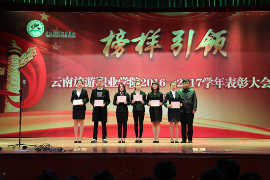 学院党委委员、副院长黄绍勇在表彰大会上做了题为《榜样引领 做新时代的领路人》的讲话。他在讲话中说道,学院始终坚持以“德”树人,以人树“品”,以“品”铸“魂”为根本,2017年学院的招生工作、就业工作、征兵工作、就业创业工作都取得了骄人成绩。同时,学院还斩获了“国际影响力”50强、学院导游专业获得了教育部和旅游局联合评审的“全国旅游院校示范专业”(云南唯一),成功入选全国旅游职业教育校企合作示范基地院校(全国仅50家)等诸多殊荣。“2017年是收获的一年,同学们收获了荣誉和信心,学院收获了新希望。”黄绍勇副院长还对在场的同学们提出了殷切希望:要有梦想、有目标;要有行动,要坚持勤奋学习,切实提高自身能力水平;要坚持弘扬正气,积极传递正能量。
