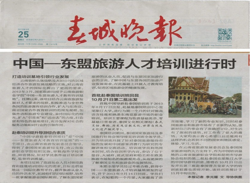 我院中国—东盟旅游人才教育培训基地成立一年以来,开发了多个针对中外学生和旅游行业人员的教育、培训项目,并顺利实施。2013年8月至9月,首批针对行业人员的赴泰导游员培训顺利完成,春城晚报于9月25日对中国—东盟旅游人才教育培训基地进行了详细报道。即日起,春城晚报每周三都将对基地项目进行追踪报道。
