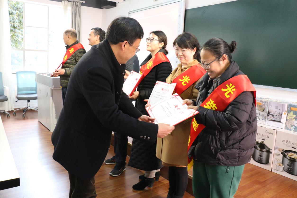 校领导为退休教职工佩戴绶带、发放荣誉证书及纪念品
