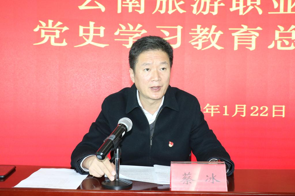 会议由校党委副书记、校长蔡冰主持。省委教育工委、省教育厅党史学习教育第七巡回指导组副组长云南师范大学商学院党委副书记朱欢勋及组员到会指导。校领导,各党支部书记,校党史学习教育领导小组办公室成员以及相关职能部门主要负责人参加会议。