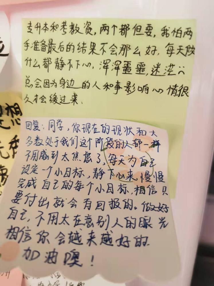 “这是一个十分有意义的活动,看到自己写的问题被人回复了,我感到很开心。”来自资源工程学院的周绍然同学面对采访时说到。来自外语学院21级的林繁同学认为学校应该多多开展此类活动,他认为“有些腼腆的同学不擅长表达,但他们可以把自己的心事张贴在墙上,也能表达自己的情绪。”