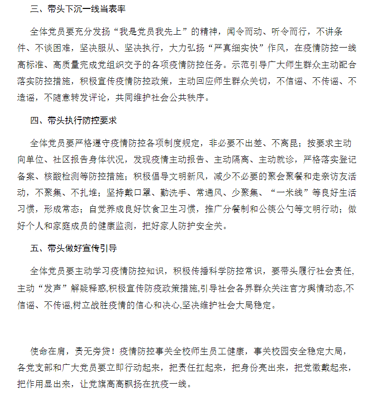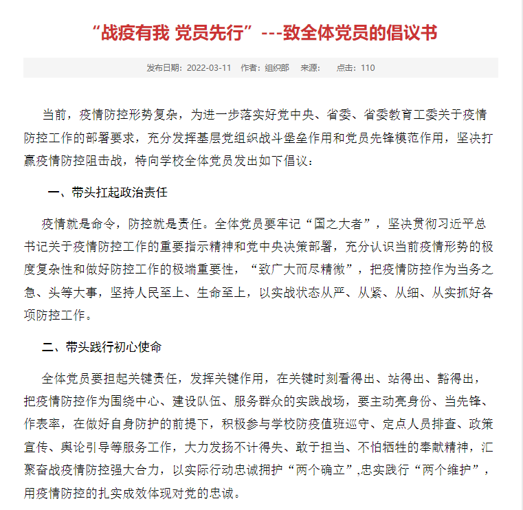 自呈贡疫情爆发以来,为认真贯彻落实省委、省政府和省委教育工委的部署要求,以时不我待的精神抓实抓细学校疫情防控各项工作。3月11日,学校党委第一时间发出《告各党支部和全体党员倡议书》《“战疫有我 党员先行”致全体党员的倡议书》,号召全体党员积极投身疫情防控一线,结合“我为群众办实事”实践活动,切实做到“五个带头”,充分发挥党组织战斗堡垒作用和党员先锋模范作用,用奉献与担当展现党员的良好精神风尚,以实际行动筑牢疫情防控“安全网”和学校“防护墙”。