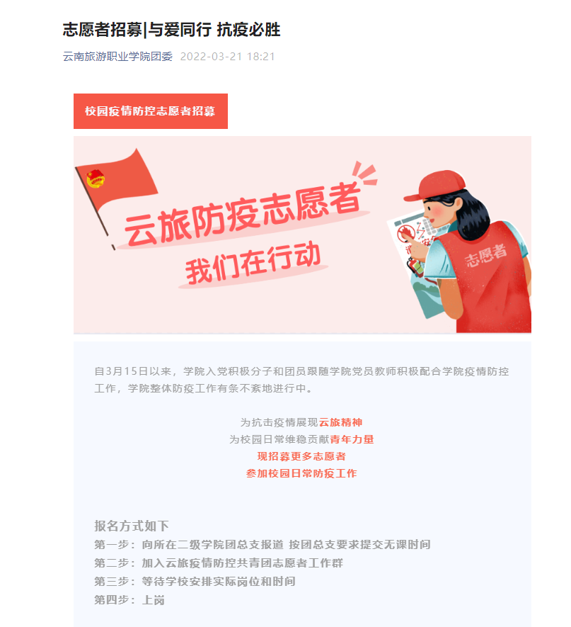 党有号召,团有行动。学校团委及时发布《“同舟共济共克时艰”致云旅学子的疫情防控倡议书》,号召广大团员青年积极行动起来,踊跃投身疫情防控志愿服务,3000余名团员青年加入战疫队伍,与广大党员志愿者拧成一股绳,在做好自身疫情防控工作的基础上,坚守责任区、当好先锋岗,积极在查寝过程中做好学生思想工作,耐心讲解疫情防控相关要求,主动“发声”解疑释惑,最大程度消除隔离学生心理阴影,解决学生实际困难,为学生当好“服务员”“勤务兵”。开通“心理加油站”服务,及时为有困扰的学生提供专业疏导,做学生的“知心人”。增设疫情防控专栏,利用校园广播宣传疫情防控相关政策信息和防疫安全提示。倡导科学防疫,组织学生社团、学生艺术团积极开展不聚集、室外、健康、积极的文体活动,促进学生身心健康,以实际行动践行初心使命、体现责任担当。