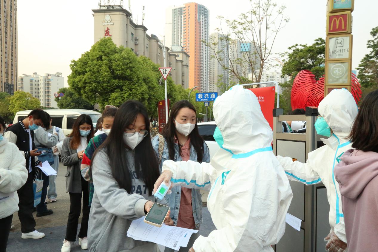 考生进考场前接受严格防疫检测