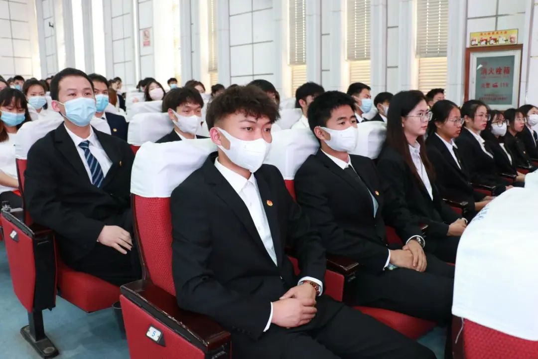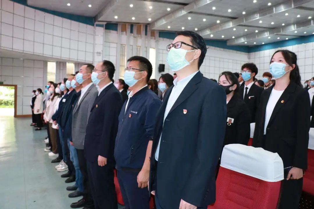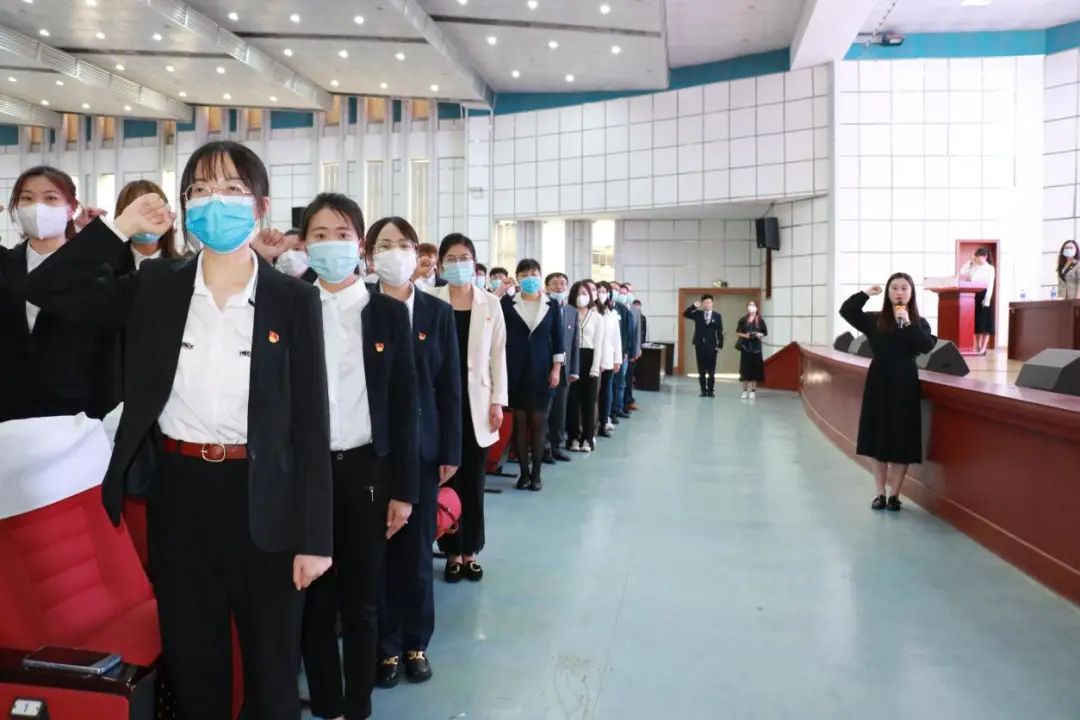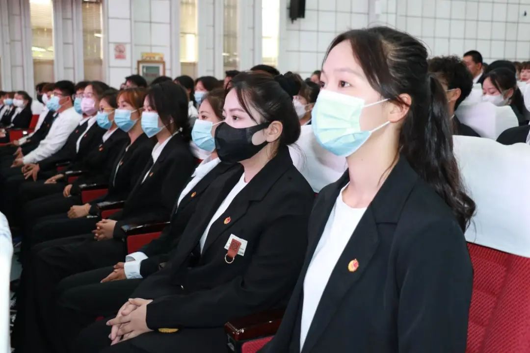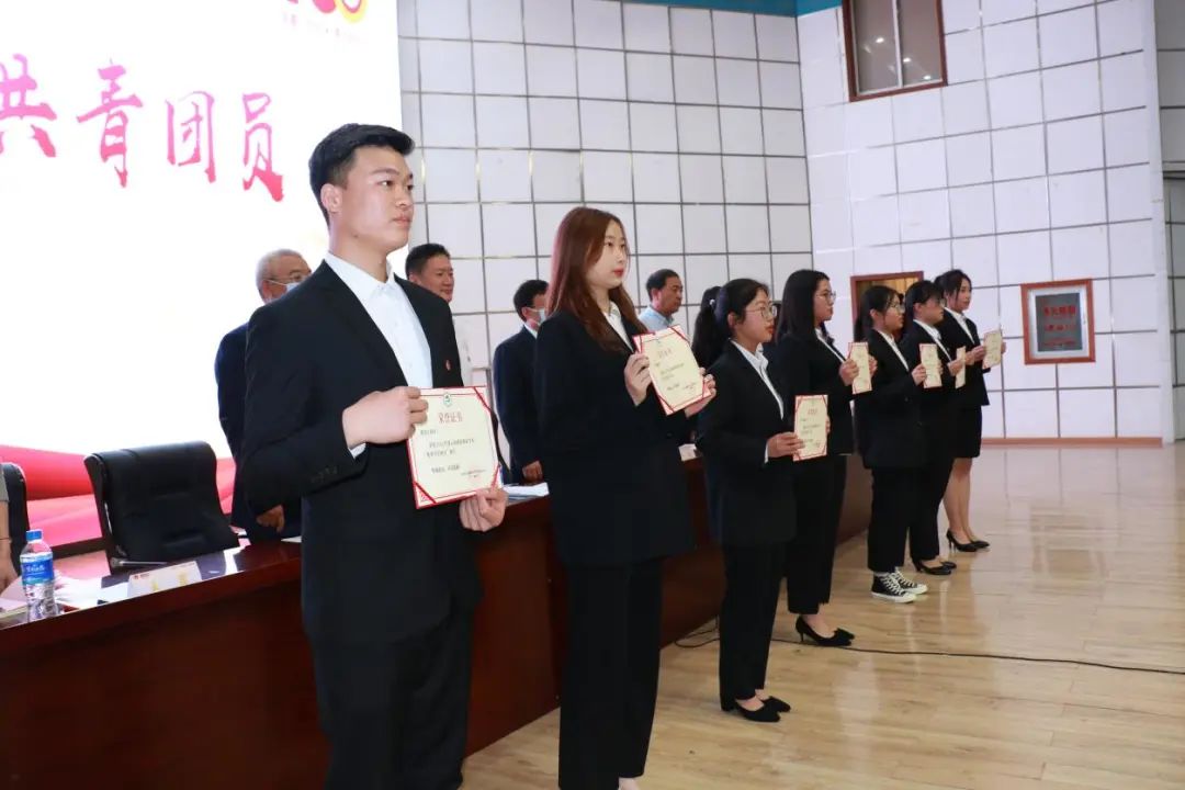 伴随着庄严雄壮的国歌,大会拉开序幕。党委副书记自德权宣读2022年新发展团员入团决定,主席台就座校领导为7名新团员代表佩戴团徽。在工作人员引领下,新入团的共青团员代表面向团旗进行了宣誓,在场的老团员重温入团誓词,来自烹饪工艺与营养2103班赵兴才同学作为新团员代表进行发言,铿锵的誓言高亢嘹亮,表达了一心向党,践行使命的坚定信心。