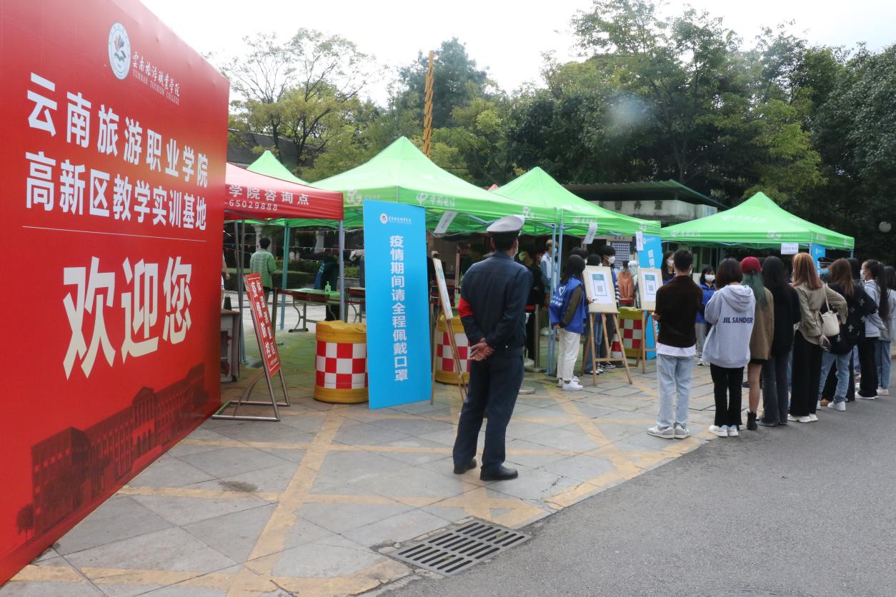 当天下午3点10分,疫情防控应急演练活动分别在龙泉路校区、高新教学实训基地、龙头街教学实训基地三个校区同时有序展开。在高新教学实训基地演练现场,随着副校长杨红英宣布演练正式开始,学生们排队依次进入校园,前后间隔一米,全程佩戴口罩,经行李消毒,扫场所码、出示48小时内阴性核酸检测证明,体温检测无异常后进入校园。如遇体温异常的学生将带至临时处置点,进一步核实有关信息,如复测体温异常学生,并经询问有涉疫风险,迅速启动应急处置程序,同时上报有关部门,严格迅速按照处置流程将发热学生转移至定点隔离,消毒组对现场环境彻底消杀。