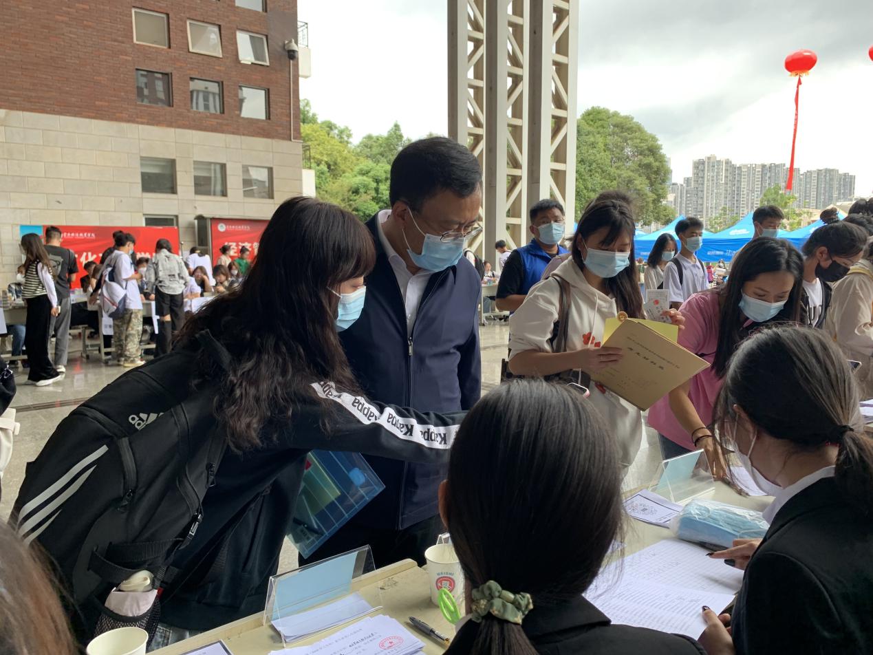 9月3日,在高新区实训基地、龙泉路校本部和龙头街教学实训基地新生报到现场,校领导亲切看望新生及家长、迎新工作人员,与新生进行亲切交谈,还来到新生宿舍,送上鼓励,让他们感受到来自学校的温暖。