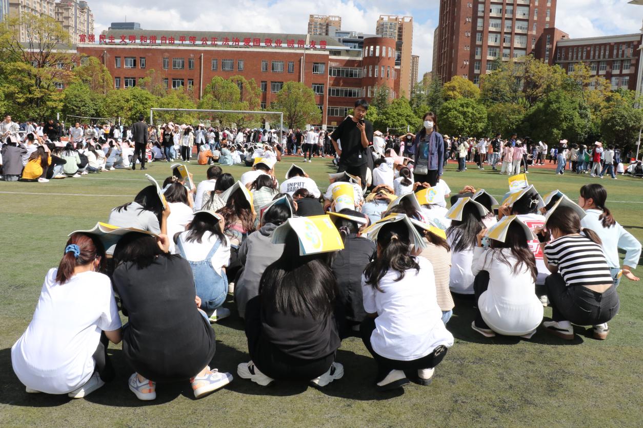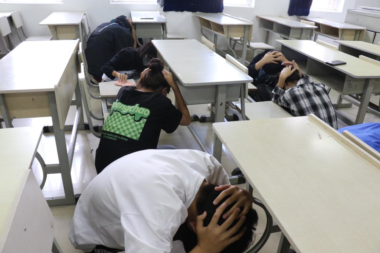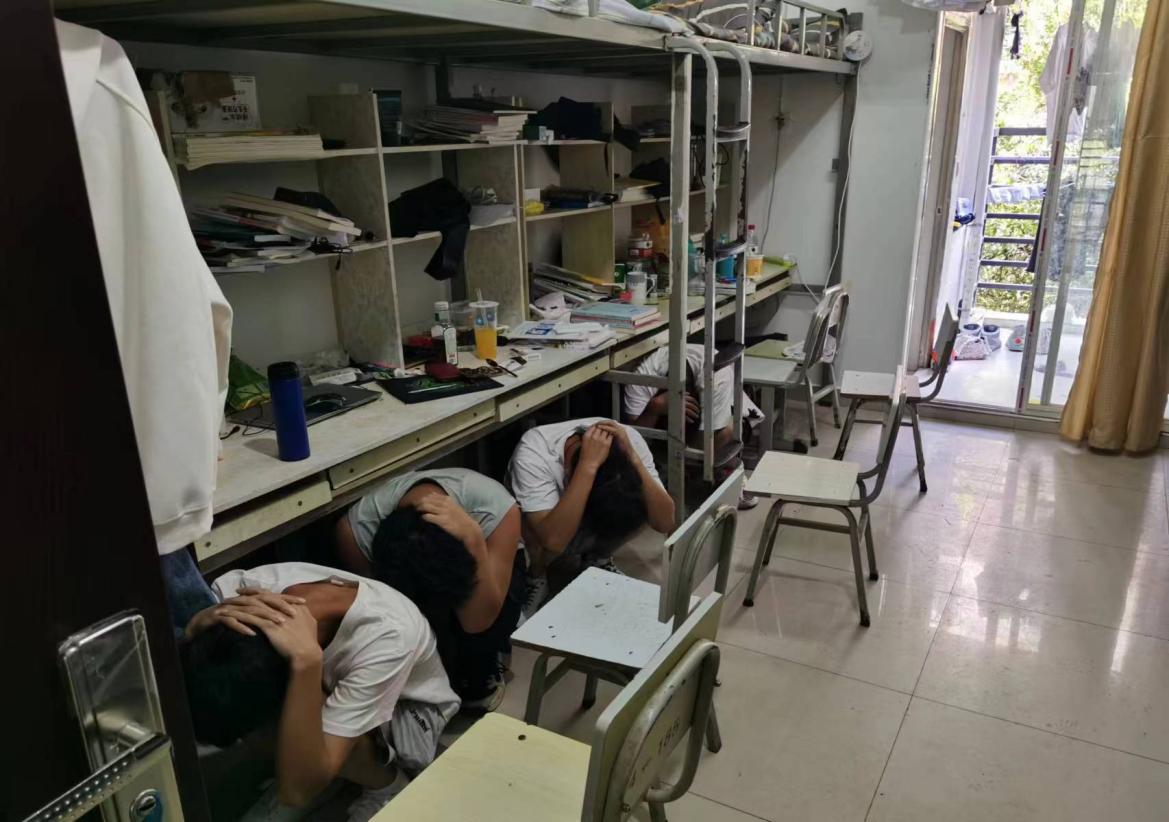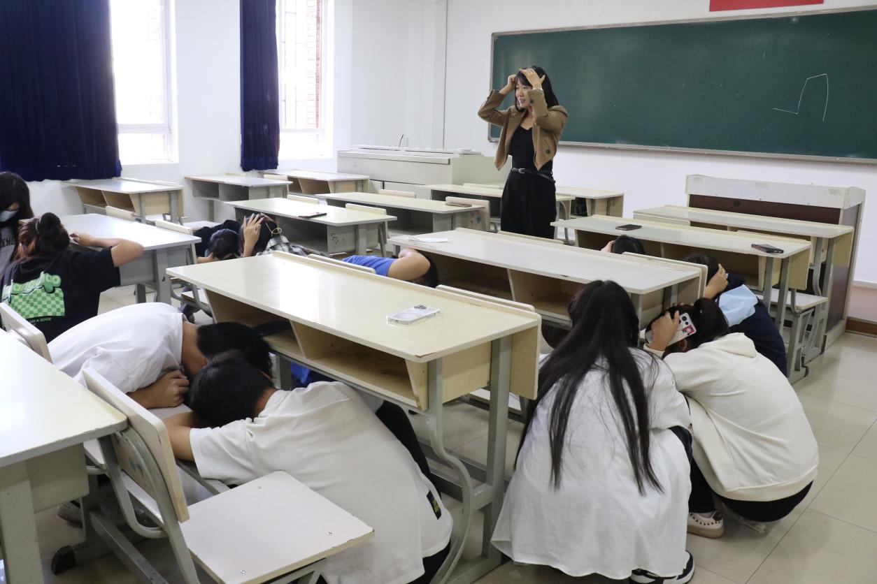 “地震来了!”14:30分,随着第一次警报声响起,演练正式开始。各班的老师对学生进行正确引导,要求学生保持镇静,听从指挥,让大家双手抱头、用书等物品顶在头上,蹲在桌子旁、墙体边或承重墙拐角处,确保得到最有效的防护。