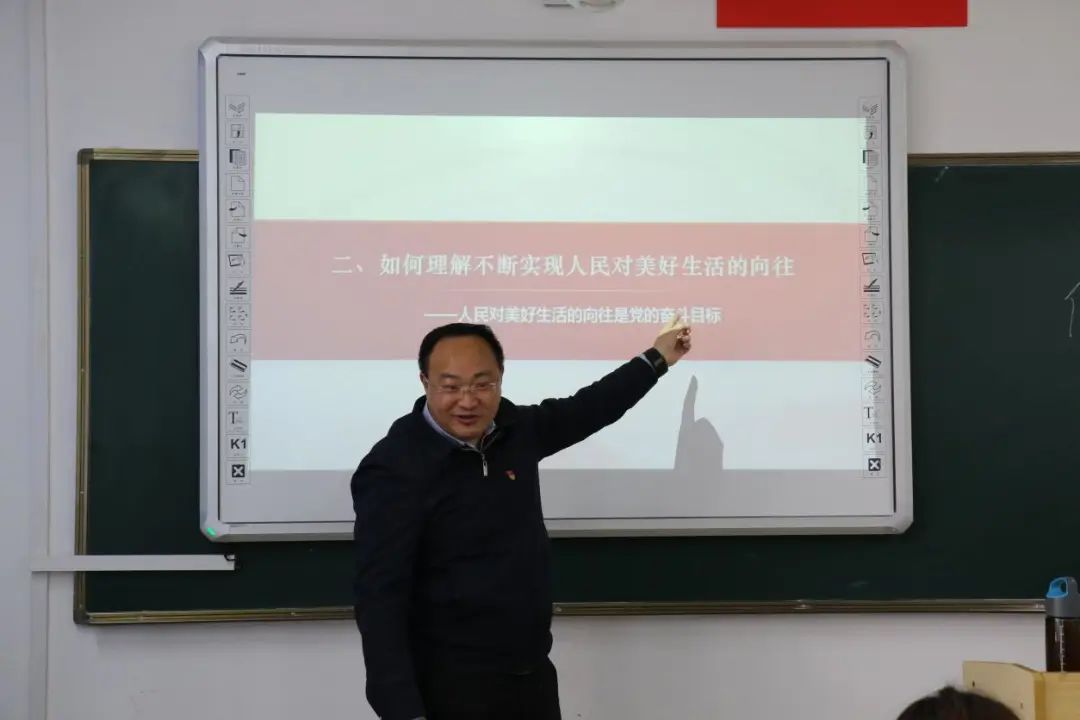 “什么是人民?”“如何理解习近平总书记的人民情怀?”校领导紧扣党的二十大精神,以“坚持以人民为中心”为主题,联系党情、国情、省情和校情,通过回顾中国共产党过去5年的工作和新时代10年的伟大变革,带领同学们深入学习领会党的二十大精神的思想精髓、核心要义。校领导结合自己的人生经历、工作经验和亲身体验,从“人民是决定党和国家前途命运的根本力量”“人民对美好生活的向往是党的奋斗目标”和“推动人的全面发展、全体人民共同富裕”三个方面进行了深入浅出、内涵丰富的讲解,生动形象地阐明了人民是真正的英雄、中国共产党为人民的美好生活而不懈奋斗、促进人的全面发展与促进共同富裕的关系等具体内容。
