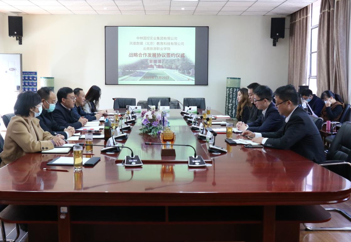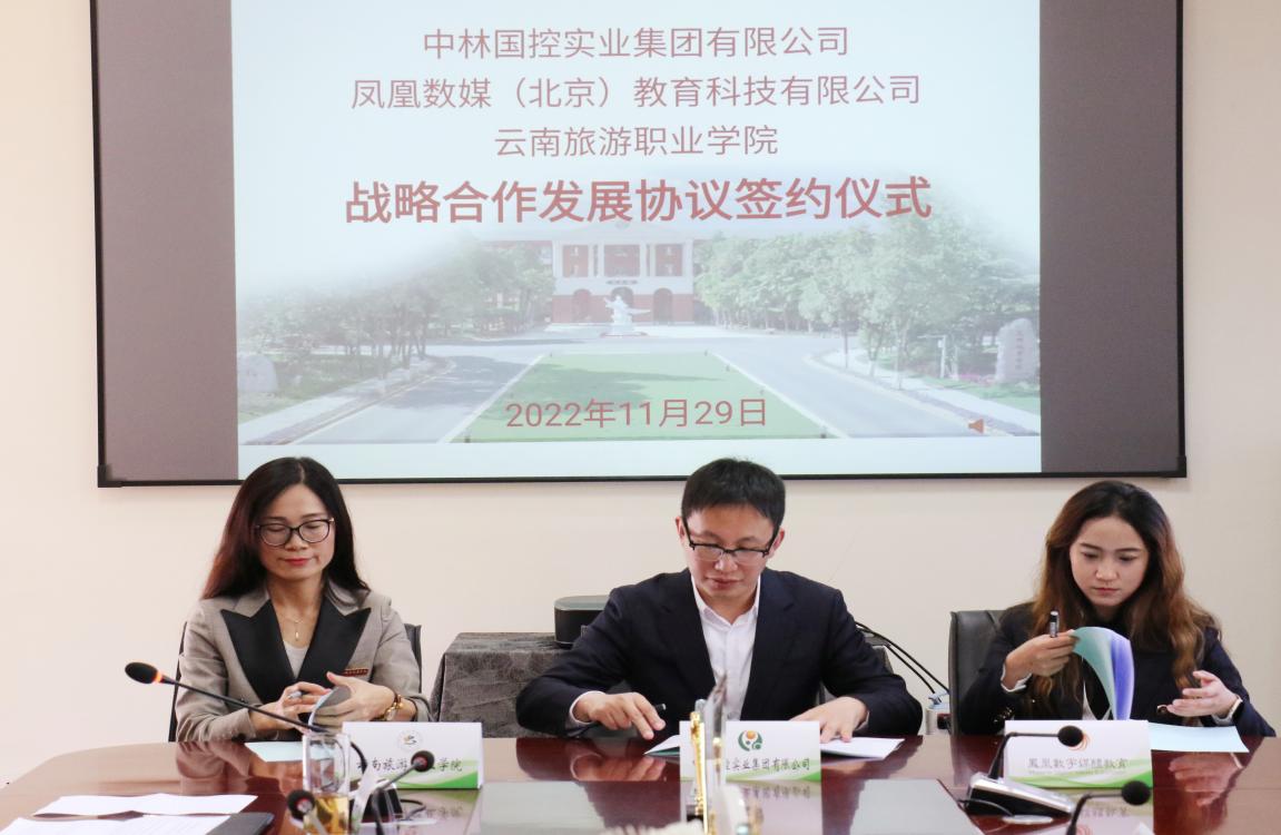为深入学习贯彻党的二十大精神,贯彻落实习近平总书记关于职业教育的重要指示批示精神,推进学校“十四五”建设发展规划深入实施,进一步深化产教融合、校企合作,增强校企协同服务云南省面向南亚东南亚辐射中心建设以及昆明国际化特大城市建设的能力,共同培养堪当民族复兴大任的高素质技能型人才,11月29日,中林国控实业集团有限公司、凤凰数媒(北京)教育科技有限公司与我校成功牵手,签署校企战略合作发展协议。签约仪式由副校长王霞主持。
