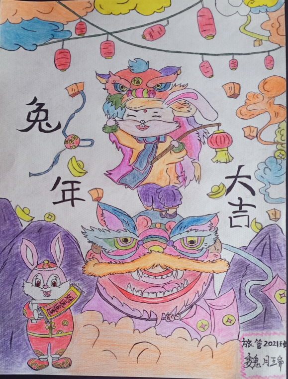 旅游管理学院 旅管2021班 魏月瑞:这幅《兔年大吉》希望新的一年大家的生活就像画一样多姿多彩,祝愿老师和同学们春光无限,岁岁平安,欢天喜地,百事顺心,笑口常开,阖家欢乐,生活美满 ,兔年大吉!