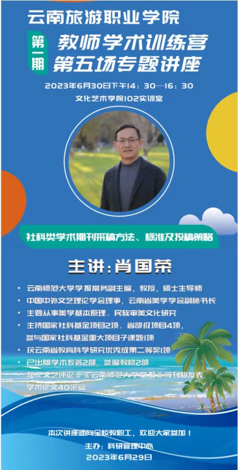 为进一步增强学院教师科研能力和水平,提高教师学术成果写作质量和论文投稿成功率,由科研管理中心主办的江南官方注册2023年第一期“教师学术训练营”第五场专题讲座于6月30日14:30—16:30在文化艺术学院102实训室举行。本次讲座特邀云南师范大学学报常务副主编肖国荣教授对青年教师进行学术指导、分享学术经验。