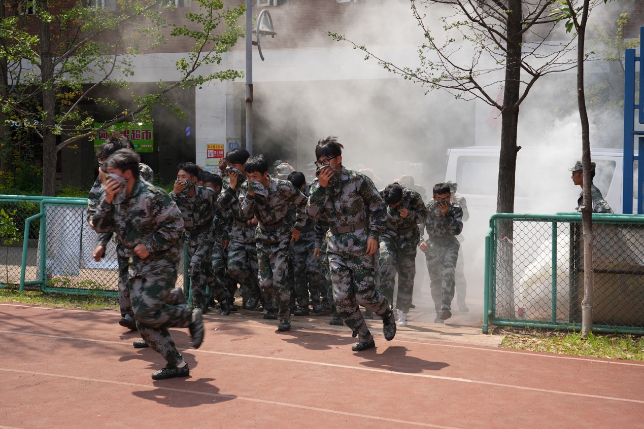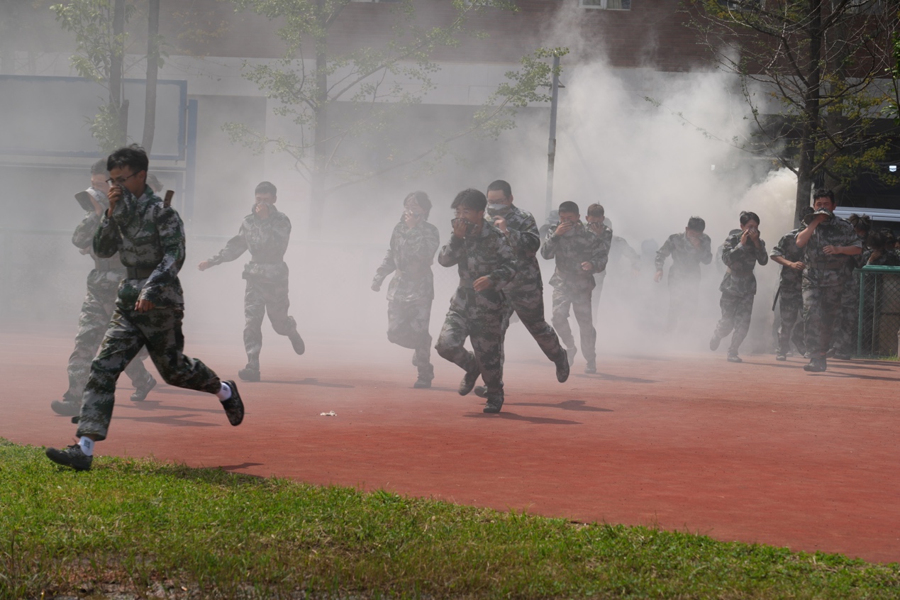 14:40分,随着表示火灾发生哨声响起,消防疏散演练正式开始,会场内模拟火灾现场的浓烟扩散开来,教官们迅速引导各集结点的同学们向安全位置疏散,同学们临危不乱捂紧口鼻,快速有序地撤离至安全区域。