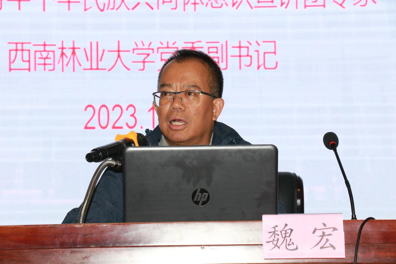 为深入学习贯彻习近平新时代中国特色社会主义思想和党的二十大精神,全面把握习近平总书记关于加强和改进民族工作的重要思想,10月11日下午,我校在报告厅举办2023年“铸牢中华民族共同体意识”专题培训。本次培训邀请云南省铸牢中华民族共同体意识宣讲团成员、西南林业大学党委副书记魏宏作专题讲授,培训由学院党委副书记王敏主持。