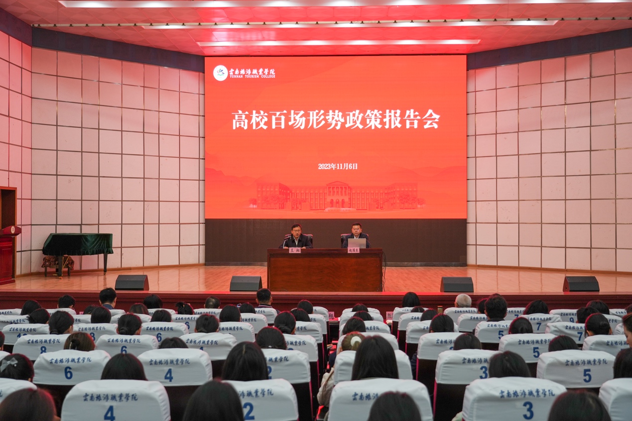 党委书记王翔在总结时指出,全校上下要把在形势政策报告会上的所学、所感和所获尽快融入到工作学习中,充分发挥学院办学特色、专业优势,及时将学习成果转化到推动学院内涵式高质量发展的实践中,深入推动云南教育高质量发展三年行动计划落地见效,积极培养赋能云南文化旅游产业高质量发展的高素质技能服务型人才,为办好党和人民满意的旅游类高等职业教育和建设文化旅游强省贡献更大的智慧和力量,共同守护好云南旅游这块金字招牌。