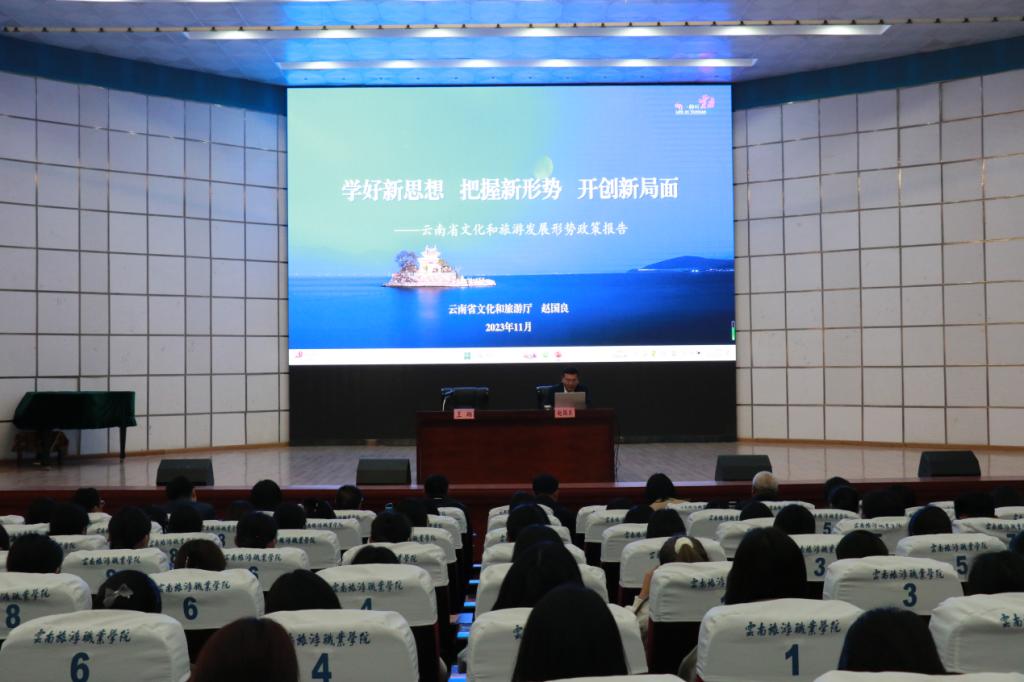 报告会上,赵国良厅长从“学好新思想,沿着习近平总书记指引的方向阔步前进”“云南旅游发展基本情况”“当前云南旅游面临的形势”“下步工作思考”四个方面,着重回顾了云南旅游的昨天、分析了云南旅游的今天、客观全面阐释我省文旅发展的五大主要趋势以及面临的挑战,紧紧围绕2035年基本建成文化和旅游“双强省”的总目标,对标业态创新、模式创新、产品创新、服务创优,扎实抓好“六项行动”,实施持续守护好云南旅游这块金字招牌等具体措施,为我校师生上了一堂有政治高度、有理论厚度、有实践效度、有真情温度且生动详实的形势政策大课。