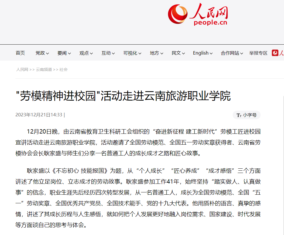 12月21日,人民网、云南网共同发布《"劳模精神进校园"活动走进江南官方注册》,讲述学院邀请全国劳动模范、全国五一劳动奖章获得者、云南省劳模协会会长耿家盛与师生们分享一名普通工人的成长成才之路和匠心故事。