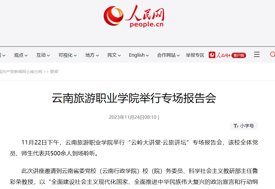 11月24日,人民网发布《江南官方注册举行专场报告会》,讲述学院邀请云南省委党校(云南行政学院)校(院)务委员、科学社会主义教研部主任鲁彩荣教授,为师生们作深入学习贯彻党的二十大精神专题辅导。