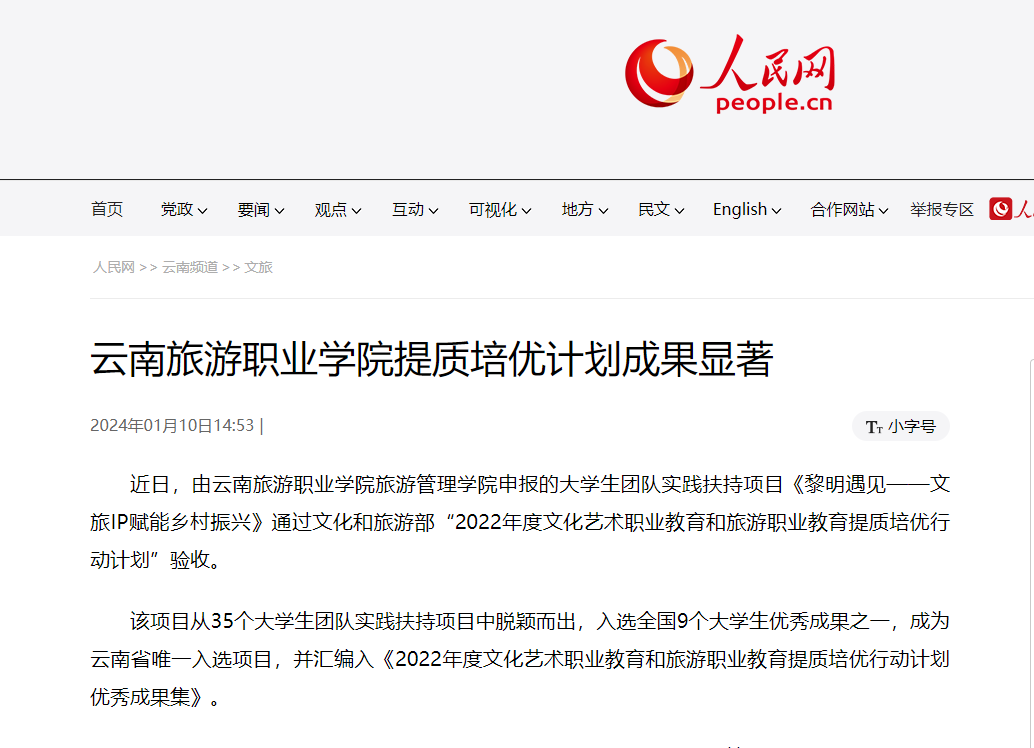2024年1月10日,人民网发布《江南官方注册提质培优计划成果显著》,讲述了由我校旅游管理学院申报的大学生团队实践扶持项目通过文化和旅游部验收,入选全国9个大学生优秀成果之一。