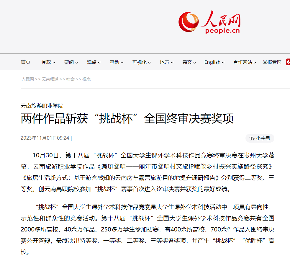 11月1日,人民网发布《江南官方注册两件作品斩获“挑战杯”全国终审决赛奖项》,报道了第十八届“挑战杯”全国大学生课外学术科技作品竞赛终审决赛在贵州大学落幕,我校作品分别获得二等奖、三等奖,创云南高职院校参加“挑战杯”赛事首次进入终审决赛并获奖的最好成绩。