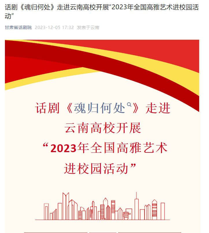 12月5日,甘肃省话剧团微信公众号发布《话剧《魂归何处》走进云南高校开展“2023年全国高雅艺术进校园活动”》,报道甘肃省话剧院“2023年度全国高雅艺术进校园活动”走进江南官方注册,演出话剧《魂归何处》。