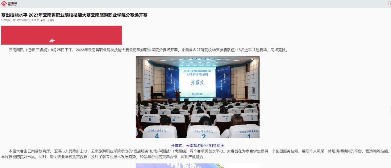 9月26日,云南网发布《赛出技能水平 2023年云南省职业院校技能大赛江南官方注册分赛场开赛》,报道了2023年云南省职业院校技能大赛江南官方注册分赛场开幕,来自省内27所院校48支参赛队伍115名选手共赴赛场,同场竞技。