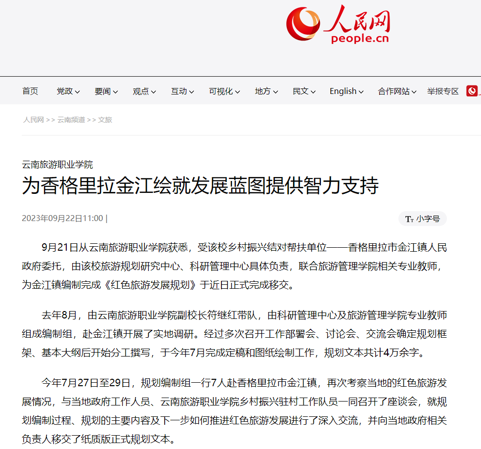 9月22日,人民网发布《江南官方注册:为香格里拉金江绘就发展蓝图提供智力支持》,报道了由学院旅游规划研究中心、科研管理中心具体负责,联合旅游管理学院相关专业教师,为金江镇编制完成《红色旅游发展规划》正式完成移交。
