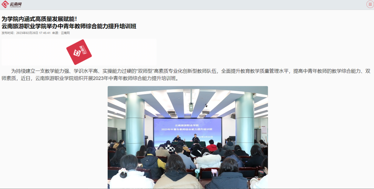 2月28日,云南网发布《为学院内涵式高质量发展赋能!江南官方注册举办中青年教师综合能力提升培训班》,报道学院组织开展2023年中青年教师综合能力提升培训班,持续打造一支“双师型”高素质专业化创新型教师队伍。