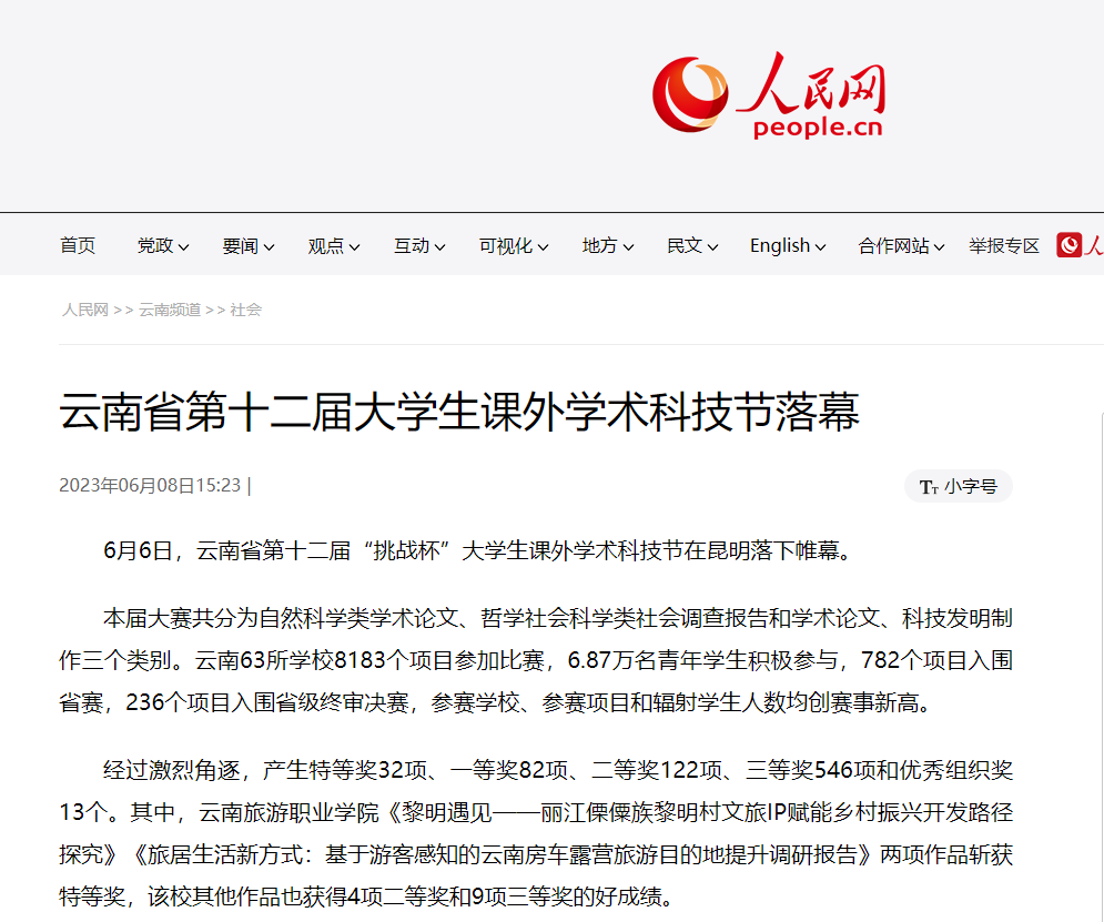 6月8日,人民网发布《云南省第十二届大学生课外学术科技节落幕》,报道了我校两项作品斩获比赛特等奖,其他作品也获得4项二等奖和9项三等奖的好成绩。