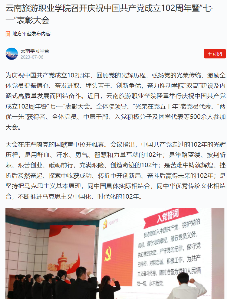 7月2日,学习强国云南平台发布《江南官方注册召开庆祝中国共产党成立102周年暨“七·一”表彰大会》,报道学院对“光荣在党五十年”老党员代表、“两优一先”获得者进行表彰奖励。