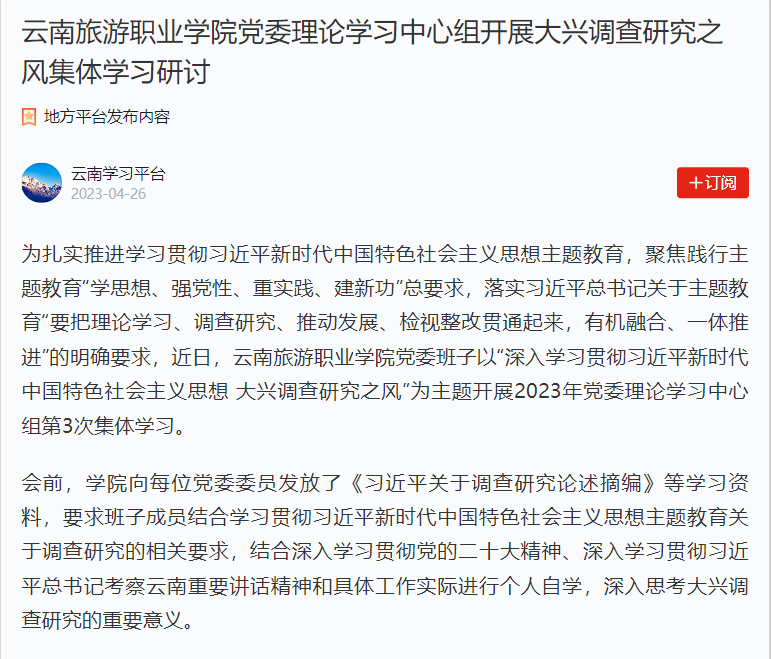 同样是4月26日,学习强国云南学习平台发布《江南官方注册党委理论学习中心组开展大兴调查研究之风集体学习研讨》,报道学院领导班子成员提高政治站位、明确重点工作、严格工作要求,以党委理论学习中心组的形式深入思考大兴调查研究的重要意义,努力在以学铸魂、以学增智、以学正风、以学促干方面取得实实在在的成效。